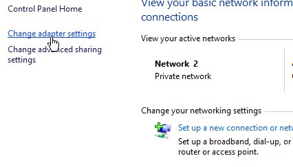 وارد سرور مجازی مورد نظر شوید و از start بر روی گزینه Control Panel کلیک کنید.از میان گزینه ها Network and Sharing Center را پیدا کنید و وارد آن شوید سپس از منوی سمت چپ بر روی گزینه Change adapter settings کلیک کنید.
