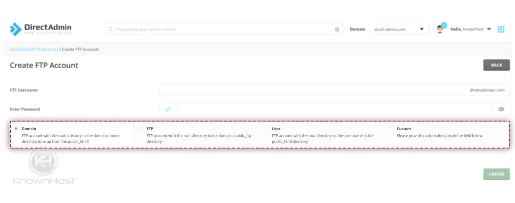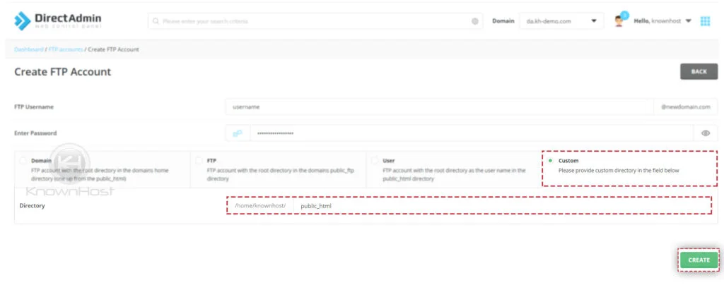 7. اکنون حساب FTP شما با موفقیت در DirectAdmin ایجاد شد.