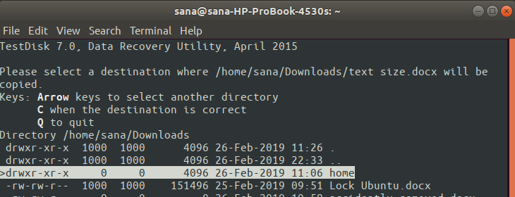هنگامیکه ابزار testdisk تمام دایرکتوریهای سیستمعامل شما را نشان داد، به دایرکتوریای بروید که در آن فایل شما حذف یا گم شده است. از آنجاییکه در این مثال فایل گم شده در دایرکتوری home بودهاست، در این جا ما به دایرکتوری home میرویم: