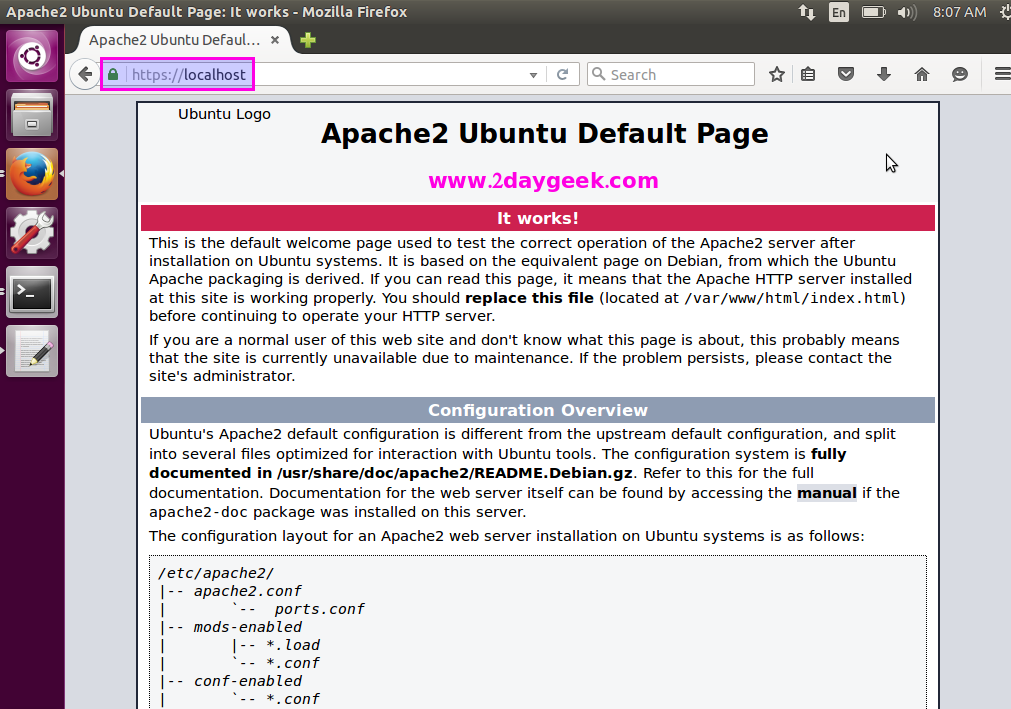 اکنون که SSL را با استفاده از Apache با موفقیت نصب، فعال و تنظیم نمودید، وقت آن است که با رفتن به یکی از آدرسهای https://localhost/ یا https://your-server-ip- یا https://127.0.0.1 عملکرد آن را نیز بررسی نمایید.