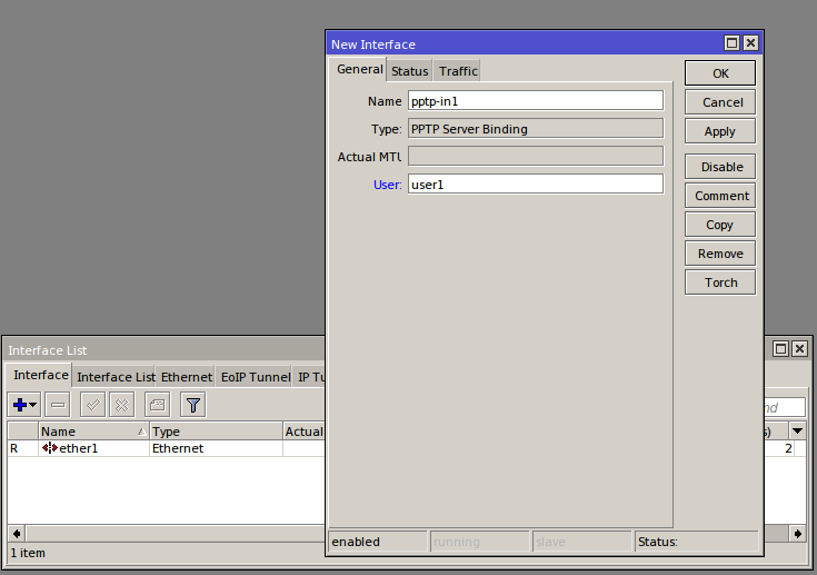 [admin@MikroTik] > interface pptp-server add name=pptp-user1 user=user1